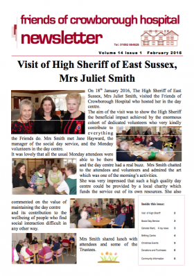 On 18th January 2016, The High Sheriff of East Sussex, Mrs Juliet Smith, visited the Friends of Crowborough Hospital who hosted her in the day centre. The aim of the visit was to show the High Sheriff the beneficial impact achieved by the enormous cohort of dedicated volunteers who very kindly contribute to everything the Friends do. Mrs Smith met Jane Hayward, the manager of the social day service, and the Monday volunteers in the day centre.